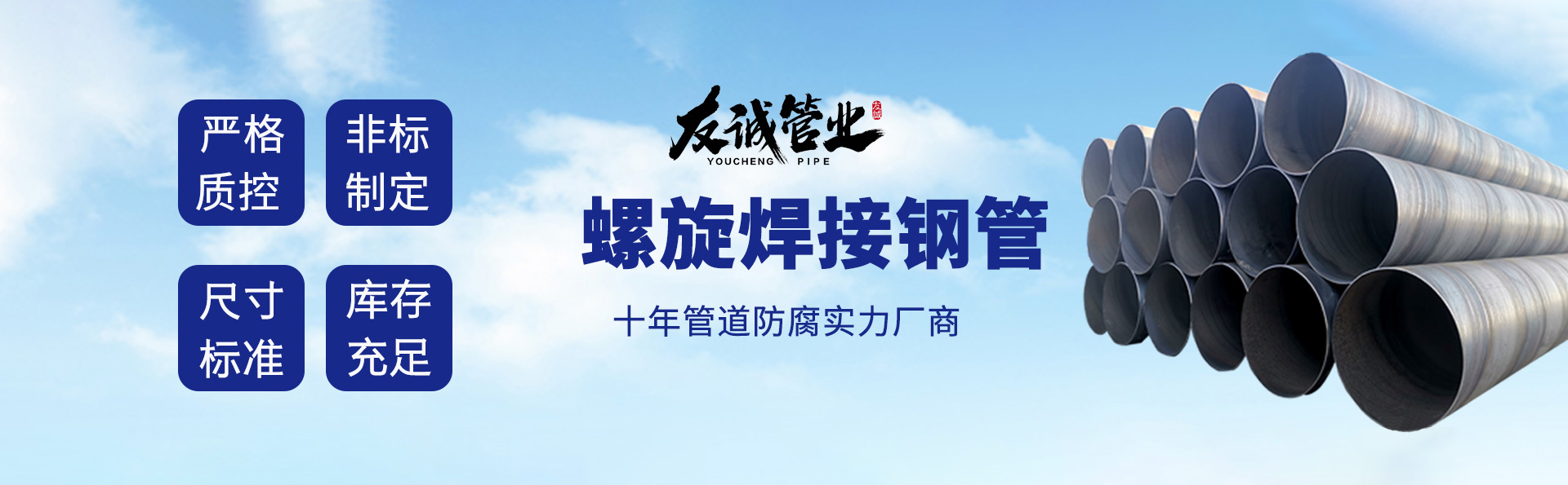 滄州友誠(chéng)管業(yè)有限公司是一家專業(yè)從事生產(chǎn)防腐涂塑管道及管件于一體的大型企業(yè)。公司注冊(cè)資金8600萬(wàn)元,位于中國(guó)管道生產(chǎn)基地—河北鹽山縣,近靠京滬高速、榮烏高速、黃石高速30公里,高鐵滄州西站40公里,天津國(guó)際機(jī)場(chǎng)、濟(jì)南遙墻機(jī)場(chǎng)150公里,為客戶來(lái)訪及業(yè)務(wù)發(fā)展提供了便利的交通條件。        鋼管系列:螺旋鋼管、無(wú)縫鋼管、ERW直縫焊管、JCOE埋弧焊直縫鋼管、熱鍍鋅鋼管。        涂塑系列:內(nèi)外涂塑鋼管、涂塑復(fù)合鋼…… 了解更多